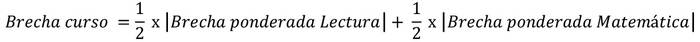 Posteriormente, se calcula la brecha para cada curso agregando las brechas ponderadas obtenidas para Lectura y Matemática en un curso. Para tomar en consideración que en un curso de un establecimiento pueden observarse brechas a favor de hombres o de mujeres, dependiendo de la asignatura. Para obtener la brecha-curso se calcula el promedio simple del valor absoluto de las brechas ponderadas para cada asignatura, como se muestra en la Fórmula N° 4.