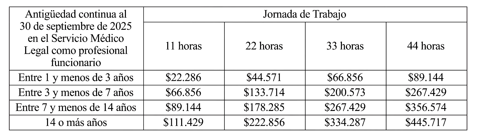 La asignación especial ascenderá a los montos mensuales que se señalan, según la antigüedad y jornada de trabajo que se indican: