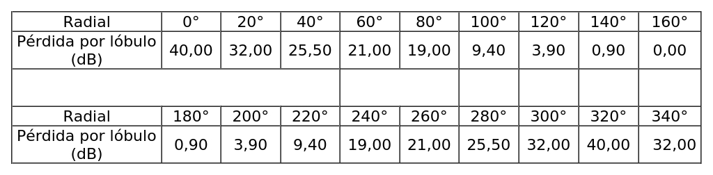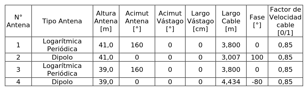 - Arreglo de antenas, de acuerdo al siguiente cuadro: