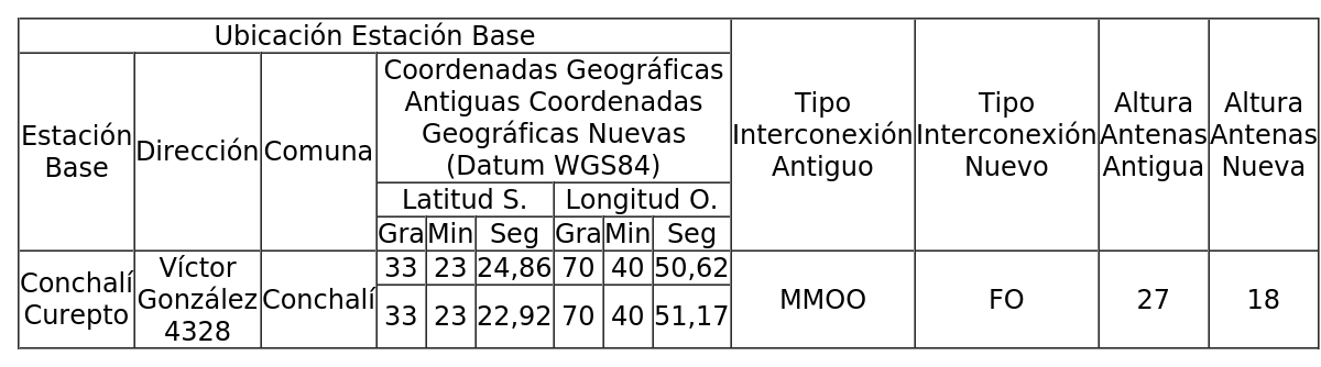 1. Autorízase a la concesionaria para rectificar las coordenadas geográficas, la altura antenas y el tipo de interconexión de una (1) Estación Base autorizada mediante decreto supremo del literal d) de los Vistos, como se indica a continuación: