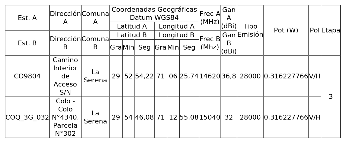 a) Lo solicitado por la interesada mediante ingreso Subtel N° 9.950 de 28.01.2025. Complementado mediante ingresos Subtel N° 49.369 de 28.04.2025, N° 91.072 de 11.08.2025, N° 91.098 y N° 91.099 de 11.08.2025, ambos de 11.08.2025. En lo que dice relación con el radioenlace que se indica en la parte resolutiva del presente decreto, quedando lo restante a lo que se resuelva en acto administrativo independiente.