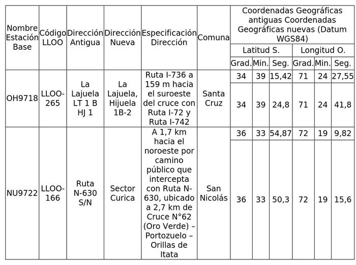 1. Autorízase a la concesionaria para modificar la dirección y coordenadas geográficas de seis (6) Estaciones Base, según se indica a continuación: