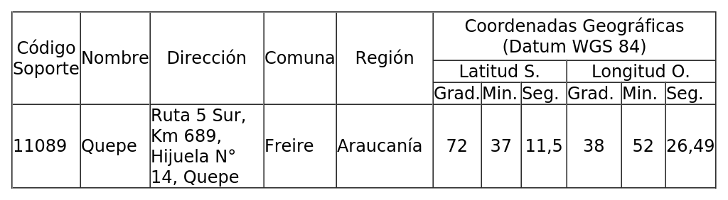 1. Autorízase a la concesionaria para modificar la dirección de una (1) Estación Base, según se indica a continuación, autorizada por decreto supremo N°65 de 2015.