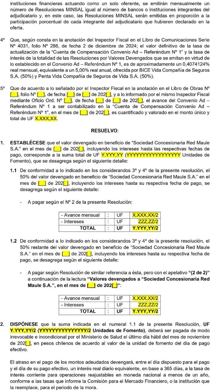 - El Convenio Ad - Referéndum Nº 1 del contrato de concesión de la obra pública fiscal denominada "Red Maule: Hospital de Cauquenes, Hospital de Constitución y Hospital de Parral", suscrito con fecha 5 de junio de 2024.
