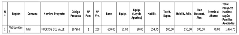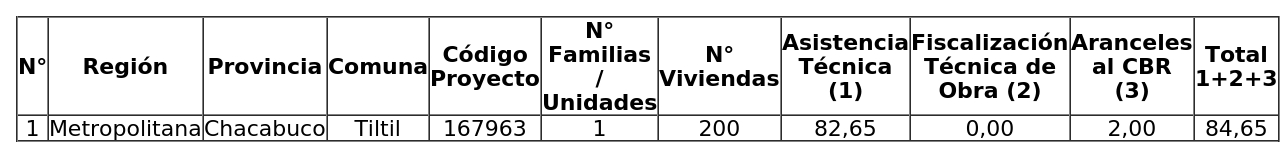 3. El monto del subsidio asignado de conformidad con el cuadro del resuelvo 2. de esta resolución comprende los siguientes valores por concepto de Servicios de Asistencia Técnica, de Labores de Fiscalización Técnica de Obra y pago de Aranceles al Conservador de Bienes Raíces: