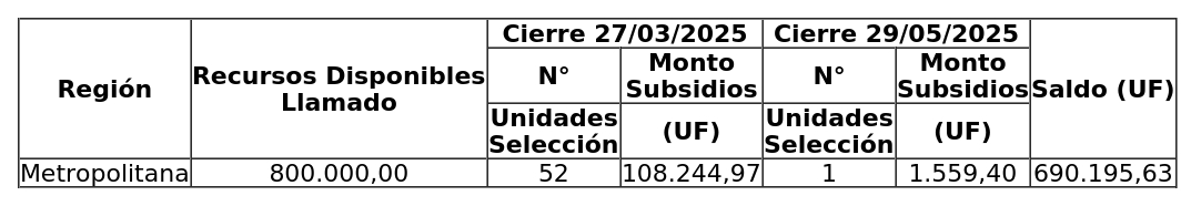 a) Que, mediante la resolución señalada en el visto d), se llamó a concurso a proyectos de Construcción en Nuevos Terrenos en las comunas de Alhué, Buin, Calera de Tango, Colina, Curacaví, El Monte, Isla de Maipo, Lampa, María Pinto, Melipilla, Padre Hurtado, Paine, Peñaflor, Pirque, San José de Maipo, San Pedro, Talagante, Tiltil, todas de la Región Metropolitana de Santiago; el área urbana establecida por el PRMS 100 correspondiente a la localidad de Lo Herrera de la comuna de San Bernardo, considerándolo desde eje vial existente denominado Eliodoro Yáñez, entre el camino El Barrancón al poniente y la Autopista Central al oriente, para el otorgamiento de subsidios del Programa Habitacional Fondo Solidario de Elección de Vivienda, regulado por el DS Nº 49 (V. y U.), de 2011, en la alternativa de Postulación Colectiva con cierres los días 27 de marzo, 29 de mayo, 31 de julio, 25 de septiembre y 27 de noviembre, todos de 2025, o hasta agotar los recursos dispuestos;