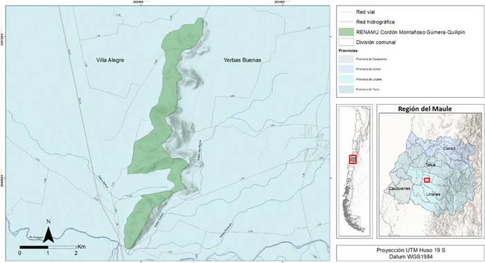 1.- Aprúebase y declárase como Reserva Natural Municipal (Renamu), Cordón Montañoso Gúmera-Quilipín, comuna de Villa Alegre, provincia de Linares, Región del Maule, de una superficie aproximada de 622 hectáreas con orientación general Sur-Sur y una longitud de 8,5 kilómetros, alcanzando un ancho máximo de 2,5 kilómetros, conforme a Planimetría Anexa, cuyos límites fueron definidos en función de las pendientes del cerro, marcando una clara diferencia con los sectores planos del valle central, y cuyas coordenadas y deslindes referenciales son los siguientes: