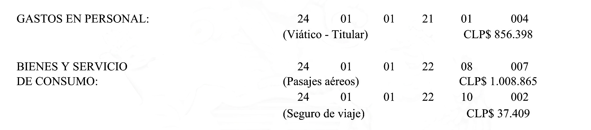 IV. Impútese el gasto por viático que demanda esta comisión de servicio al extranjero, en dólares, en su equivalente en moneda nacional, y el gasto por pasajes aéreos y seguro de viaje, en pesos chilenos, todos correspondientes al presupuesto vigente de la Subsecretaría de Energía, según el siguiente detalle: