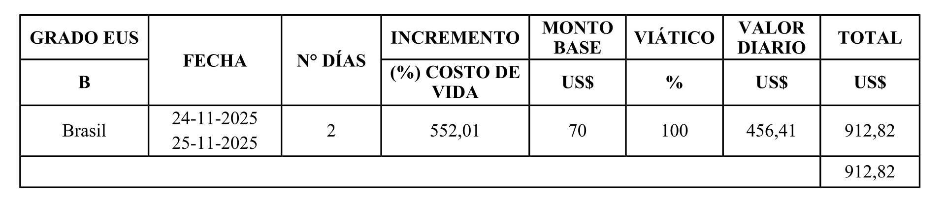 VI. Déjase establecido que no procede el pago de viático por el día 26 de noviembre de 2025, por encontrarse en tránsito a destino.