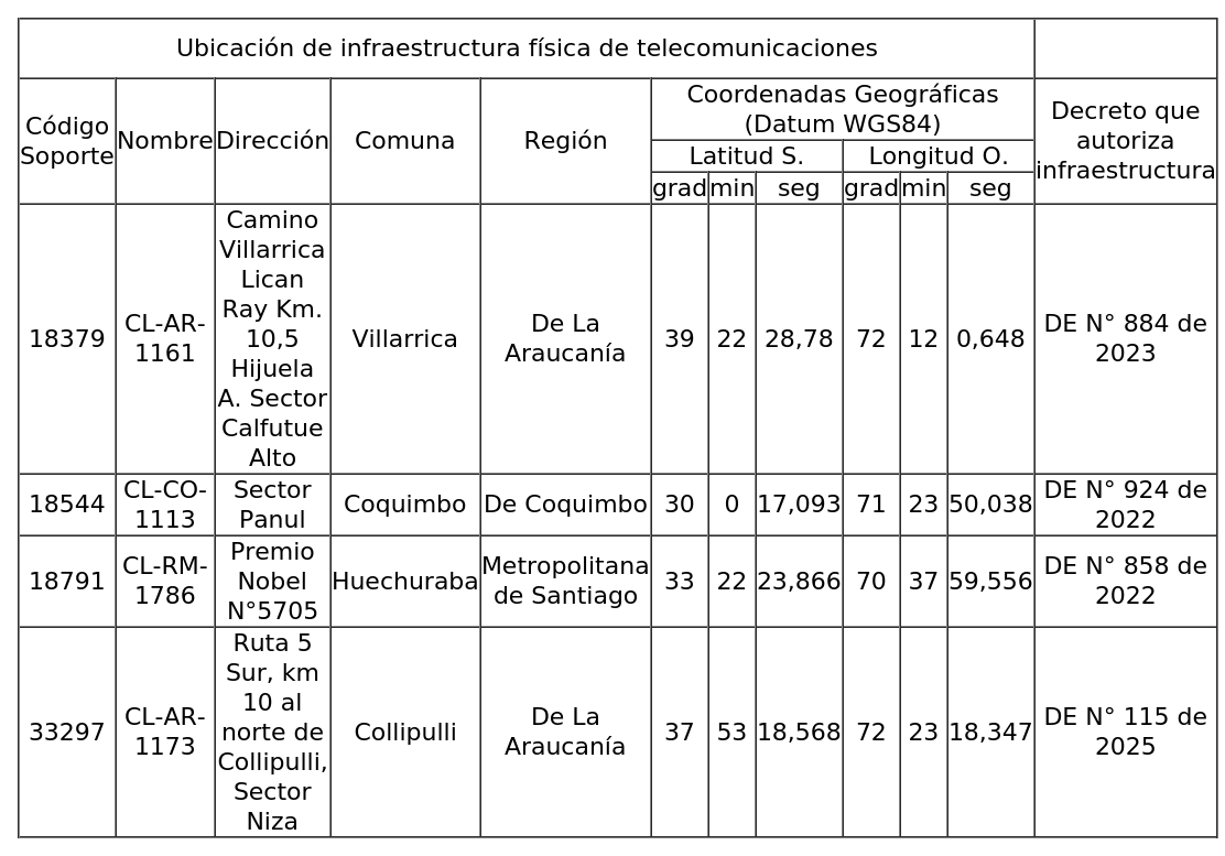 e) El decreto supremo N°99 de 2012, del Ministerio de Transportes y Telecomunicaciones, que fija el reglamento que establece los requisitos para obtener, instalar, operar y explotar concesiones de servicios intermedios de telecomunicaciones que únicamente provean infraestructura física para telecomunicaciones.