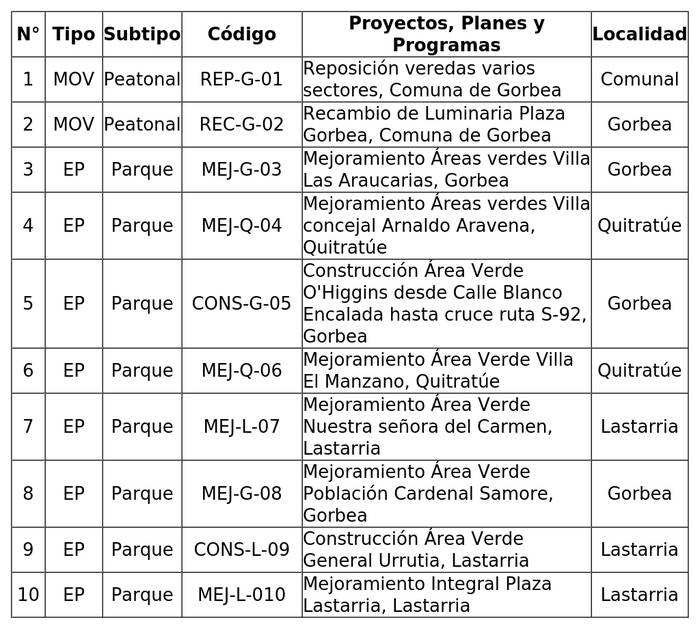 10.- El Concejo Municipal de Gorbea, en su Sesión Ordinaria de 20 de enero de 2026, de acuerdo a lo dispuesto en la Ley N° 18.695, Orgánica Constitucional de Municipalidades, ha acordado lo siguiente: Acuerdo N° 030, Ord. N° 145 2026 Apruébese del Primer "Plan de Inversiones en Infraestructura de Movilidad y Espacio Público (PIIMEP)" y Cartera Priorizada, de la comuna de Gorbea.