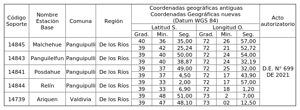 1. Autorízase a la concesionaria a rectificar las coordenadas geográficas de cinco (5) soportes autorizados mediante decreto exento N° 699 de 2021, según se indica a continuación: