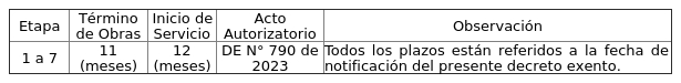 1. Autorízase a la concesionaria un nuevo plazo de término de obras e inicio de servicio, en la comuna de Rengo, Región del Libertador General Bernardo O'Higgins, según se indica a continuación, autorizada por decreto exento N° 790 de 2023.