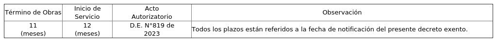 1. Autorízase a la concesionaria un nuevo plazo de término de obras e inicio de servicio, en la comuna de Vilcún, Región de la Araucanía, según se indica a continuación, autorizada por decreto exento N°819 de 2023.