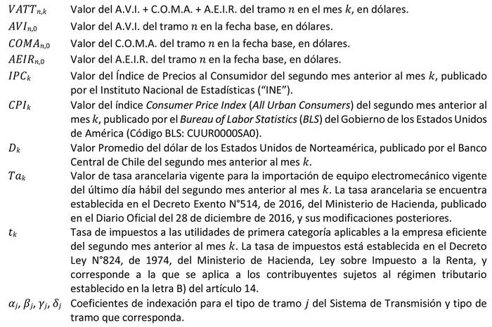 En la fórmula anterior, los subíndices "k" corresponden al mes en el cual las tarifas de las instalaciones de los sistemas de transmisión zonal serán aplicadas, mientras que los subíndices "0" corresponden a los valores base de los índices.