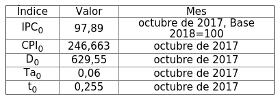En la fórmula de indexación antes indicada, la definición de los índices y de los valores base correspondientes son los siguientes:
