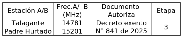 1. Autorízase a la concesionaria para rectificar la frecuencia de un (1) Radioenlace, autorizado por decreto exento Nº 841 de 2025, del Ministerio de Transportes y Telecomunicaciones, según se indica a continuación: