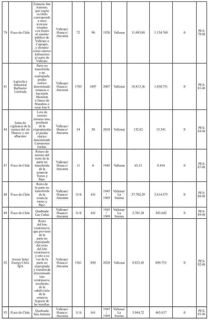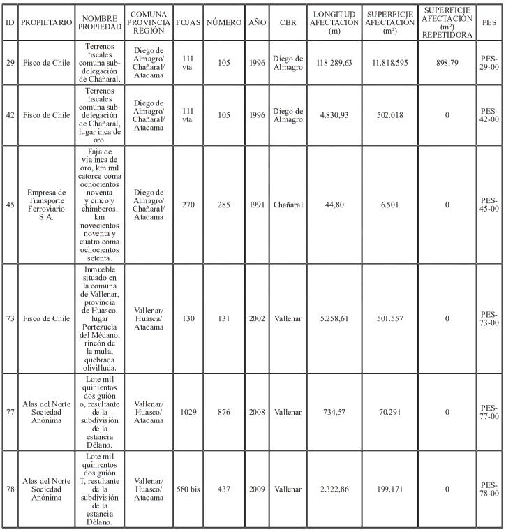 Artículo 7°.- Constitúyanse, de acuerdo con lo establecido en la Ley General de Servicios Eléctricos, las servidumbres para el establecimiento del Proyecto en los predios que se indican a continuación: