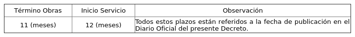 1. Autorízase a la concesionaria a modificar su concesión en el sentido de ampliar los plazos de Término de Obras e Inicio de Servicios, de la zona de servicio autorizada por decreto exento N° 811 de 2023, del Ministerio de Transportes y Telecomunicaciones, según se indica a continuación: