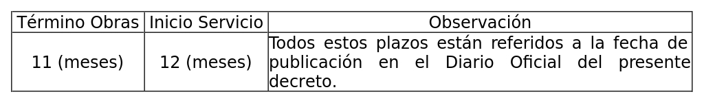 1. Autorízase a la concesionaria a modificar su concesión en el sentido de ampliar los plazos de Término de Obras e Inicio de Servicios, de la zona de servicio autorizada por decreto exento Nº 887 de 2023, del Ministerio de Transportes y Telecomunicaciones, según se indica a continuación: