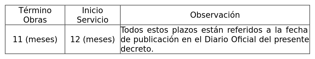 1. Autorízase a la concesionaria a modificar su concesión en el sentido de ampliar los plazos de Término de Obras e Inicio de Servicios, de la zona de servicio autorizada por decreto exento N° 785 de 2023, del Ministerio de Transportes y Telecomunicaciones, según se indica a continuación: