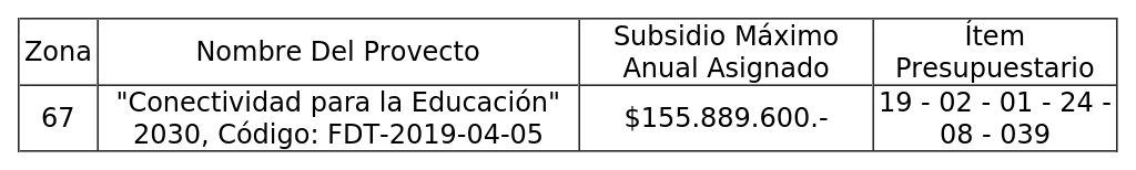 c) La resolución exenta Nº 2.480, de fecha 16.12.2025, de la Subsecretaría, por la cual se asignó a Texus Networks SpA, el Proyecto "Conectividad para la Educación 2030", Código FDT-2019-04-05 para la Zona Nº 67.