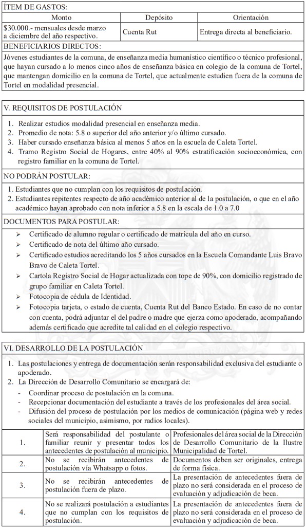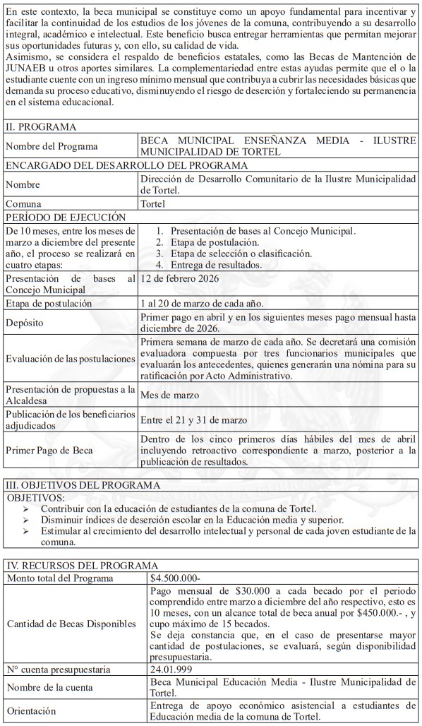 2.- Autorización del Honorable Concejo Municipal de la Ilustre Municipalidad de Tortel. De conformidad a lo dispuesto en el artículo quinto letra g) de la Ley 18.695, se deja constancia en el acuerdo Nº 96, aprobación de la iniciativa de Becas Municipales con cargo al presupuesto año 2026, por $30.000 pesos mensuales (marzo a diciembre) en la educación media, por el Honorable Concejo Municipal en sesión ordinaria Nº 43 de fecha 13 de febrero de 2026.