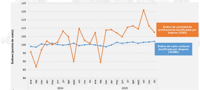 Gráfico 1: Evolución de los Índices de costo IVUBI e ICBI del sistema Isapre (abiertas y cerradas). Periodo de análisis enero - diciembre 2025.