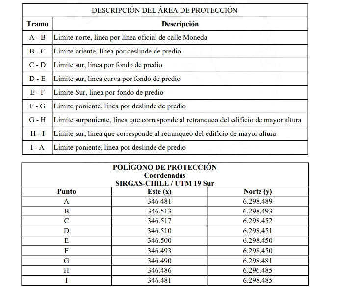El plano de límites oficial N° 6-2025, establece para la Iglesia de Las Agustinas y la construcción anexa un área protegida de 1.055 m², en los siguientes términos: