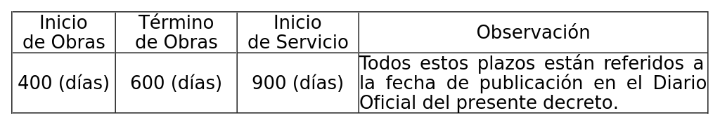 4. Los plazos para el inicio y término de obras e inicio de servicio son los que se indican a continuación: