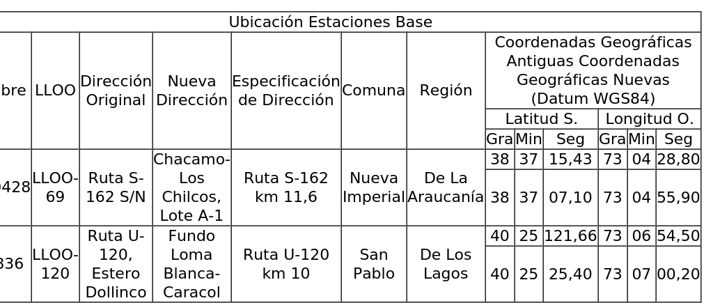 1. Autorízase a la concesionaria para modificar la dirección y coordenadas geográficas de dos (2) Estaciones Base, autorizadas mediante el decreto supremo del literal c) de los Vistos, en infraestructura nueva, como se indica a continuación.