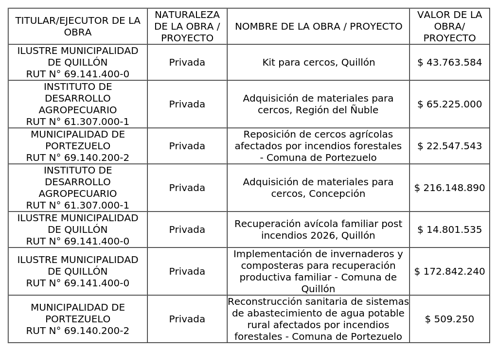 1.- Identifíquese las siguientes obras específicas, de naturaleza privada, que pueden financiarse con donaciones susceptibles de acogerse a los beneficios tributarios a que se refiere la ley N° 20.444, así como también el órgano ejecutor, individualizado en la primera columna de la tabla adjunta.