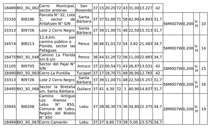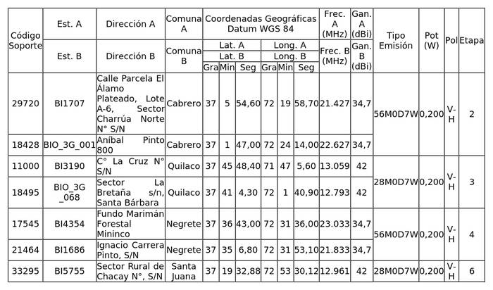 1. Autorízase a la concesionaria para instalar, operar y explotar nueve (9) radioenlaces punto a punto, en la Región del Biobío, según se indica a continuación: