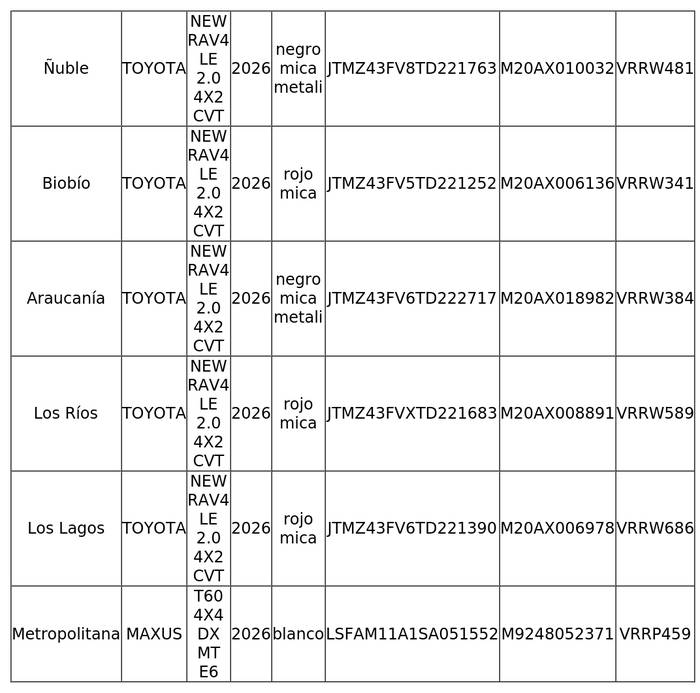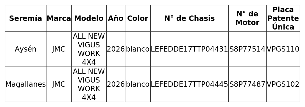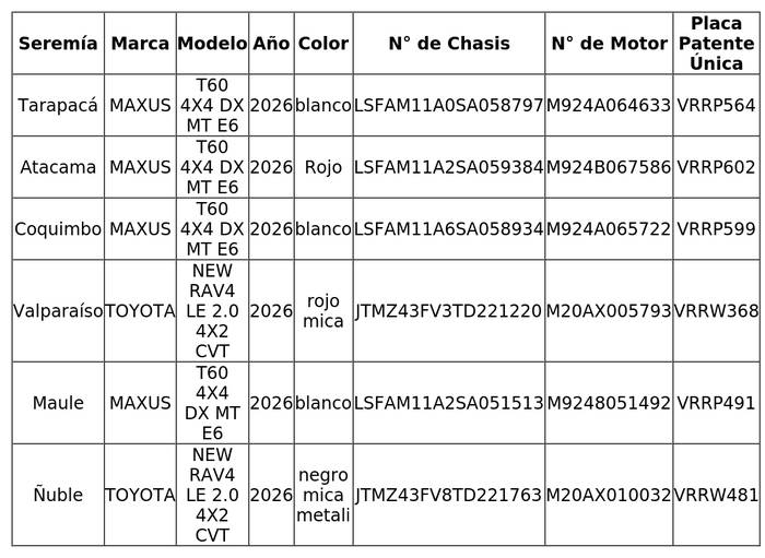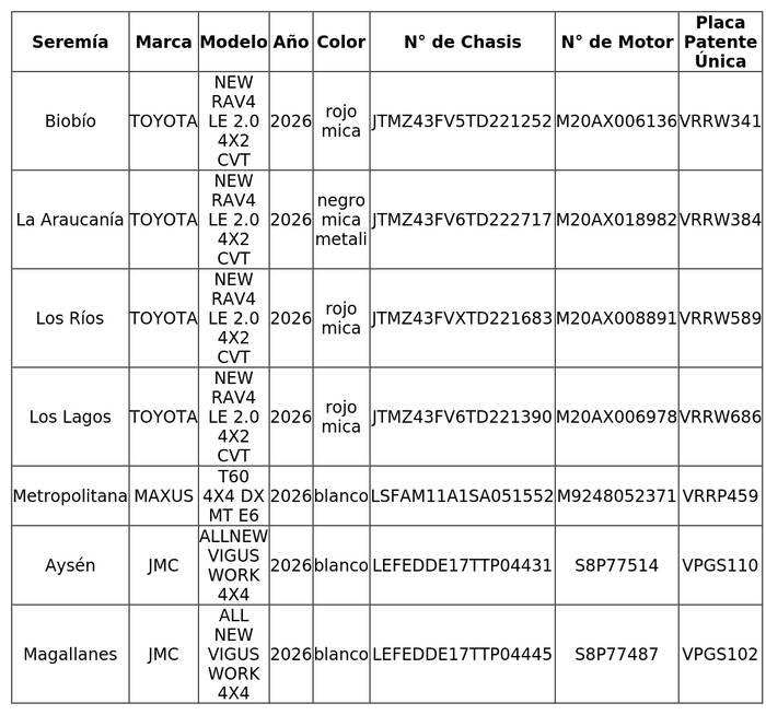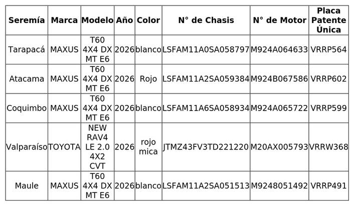 5.- Que, por medio de compra bajo la modalidad de Gran Compra, ID N° 78711, la Subsecretaría de Seguridad Pública adquirió 11 vehículos motorizados a través del portal www.mercadopublico.cl, mediante la emisión y posterior aceptación de las órdenes de compra, para las Secretarías Regionales Ministeriales de Seguridad Pública de las regiones de Tarapacá, Atacama, Coquimbo, Valparaíso, Maule, Ñuble, Biobío, La Araucanía, Los Ríos, Los Lagos y Metropolitana, cuyo detalle se indica en la siguiente tabla: