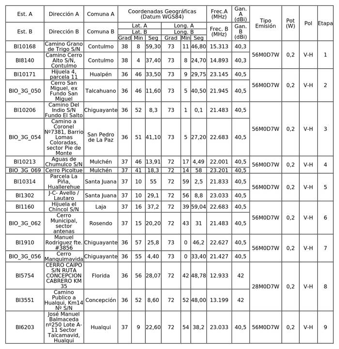 Los radioenlaces se conectarán a la red existente, a través de medios propios o de terceros debidamente autorizados.