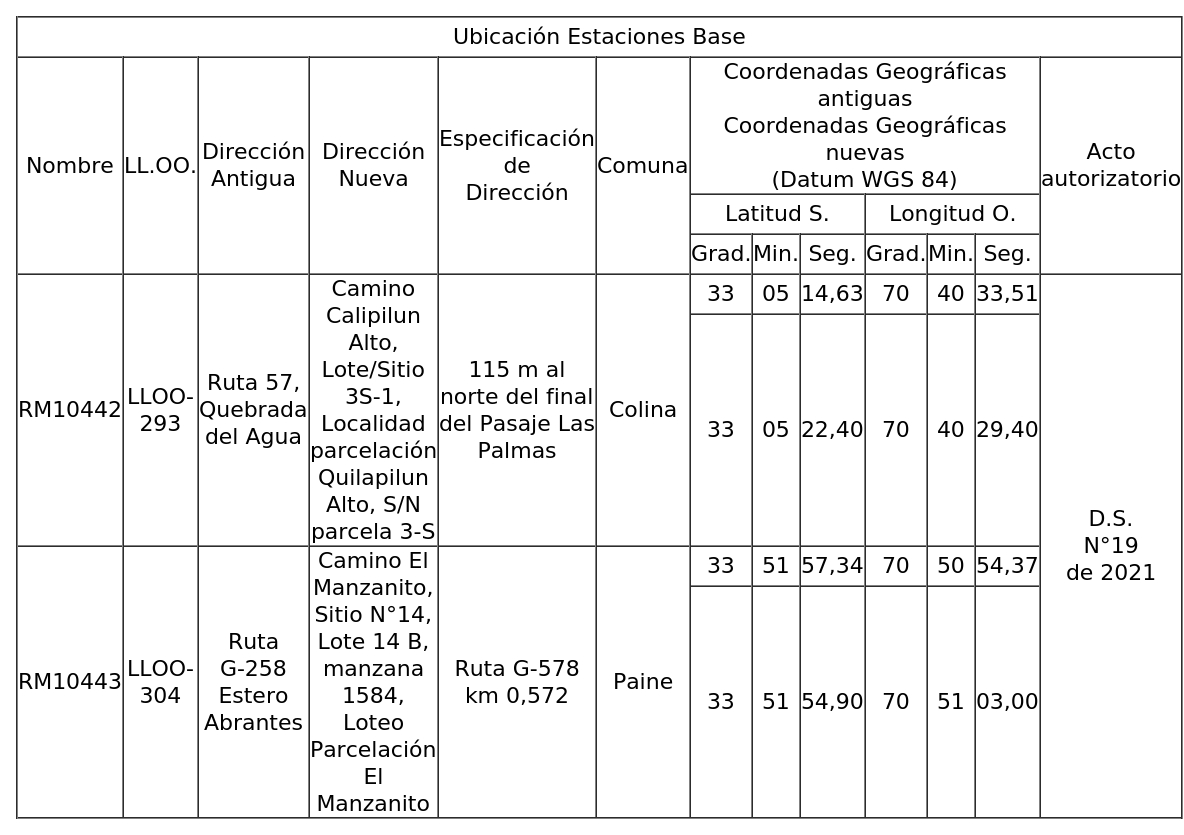 1. Autorízase a la concesionaria a modificar la dirección y coordenadas geográficas de dos (2) Estaciones Base, según se indica a continuación: