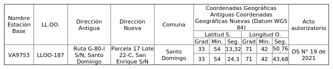 1. Autorízase a la concesionaria para modificar la dirección y coordenadas geográficas de una (1) Estación Base, según se indican a continuación: