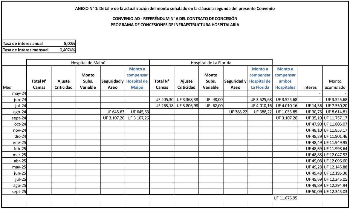 2.1 Por concepto del aumento transitorio en el número de camas, las adecuaciones transitorias en recintos que permitieron modificar la criticidad de camas, y realizar adecuaciones de infraestructura y en la prestación de los servicios concesionados, para complejizar los recintos, realizado por la respectiva Subsecretaría de Redes Asistenciales, se fija la cantidad única y total, a suma alzada, de UF 11.676,95 (once mil seiscientas setenta y seis coma noventa y cinco Unidades de Fomento), neta de IVA., de conformidad al detalle que se adjunta como Anexo N° 1 al presente Convenio.
