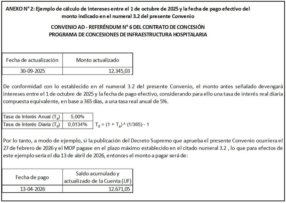 o Anexo Nº 2: Ejemplo de cálculo de intereses entre el 1 de octubre de 2025 y la fecha de pago efectivo del monto indicado en el numeral 3.2 del presente Convenio.
