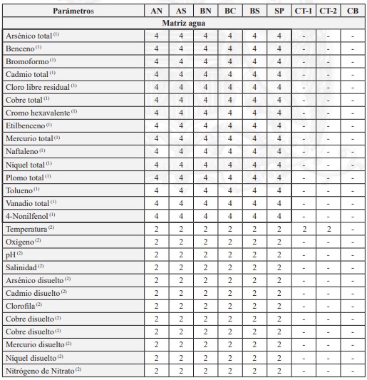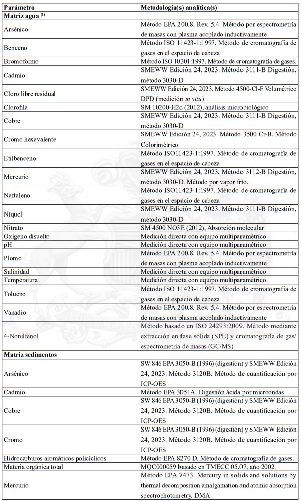 - Agua de mar: Arsénico total; Benceno; Bromoformo; Cadmio total; Cloro libre residual; Cobre total; Cromo hexavalente; Etilbenceno; Mercurio total; Naftaleno; Níquel total; Plomo total; Tolueno; Vanadio total y 4-Nonilfenol.