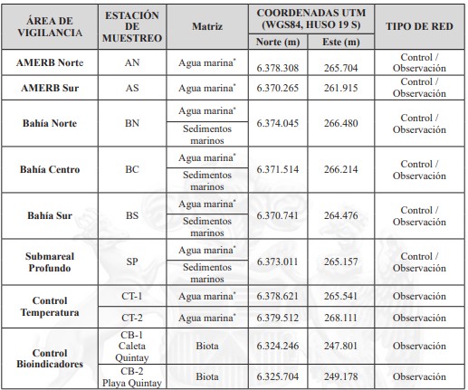 Tabla 1. Áreas de vigilancia y estaciones de monitoreo que componen la Red de Control y la Red de Observación de la NSCA bahía Quintero-Puchuncaví.