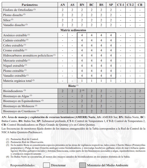 En el Anexo 1 se indica el detalle de los parámetros a medir en cada una de las estaciones de la Tabla 1, junto con la frecuencia de monitoreo considerada en un año calendario, y el organismo público responsable del muestreo, medición y/o análisis de cada uno de ellos.