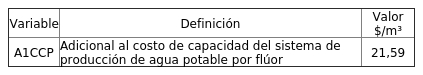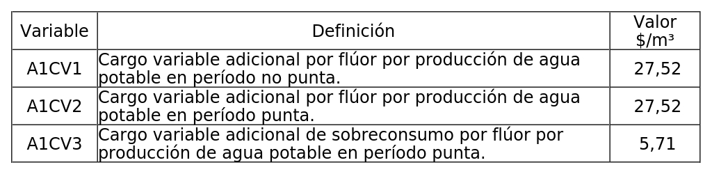 En las zonas abastecidas por sistemas de producción que incorporen la fluoración del agua potable, los respectivos cargos variables de producción de agua potable, indicados como CV1, CV2 y CV3, aumentarán de acuerdo con la siguiente tabla: