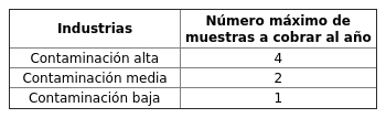 Los valores y número máximo de muestras a cobrar al año se han determinado de acuerdo a la clasificación de las industrias, según el nivel de contaminación del efluente evacuado, cuya definición se indica a continuación: