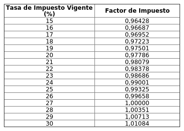 Los valores resultantes de la aplicación de los cargos anteriormente mencionados en este decreto se incrementarán en función de la tasa de tributación vigente que grava las utilidades de las sociedades anónimas abiertas, considerando los factores para las tasas de tributación que se indican a continuación (tasas intermedias se interpolarán linealmente):