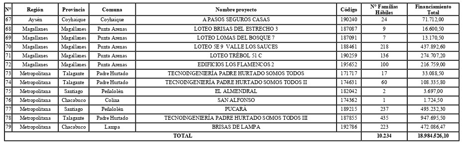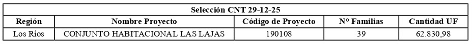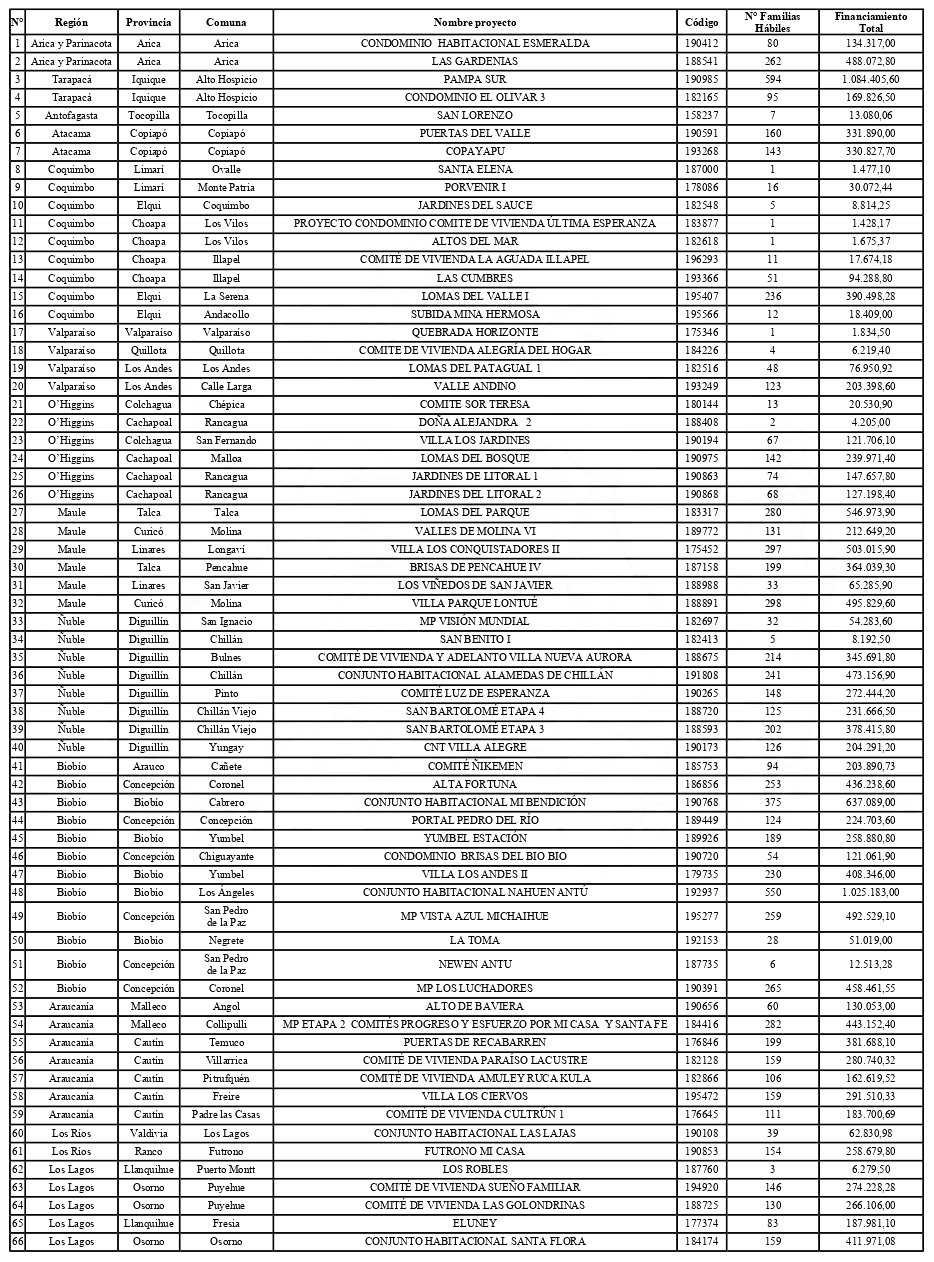 2. Apruébase la siguiente nómina de proyectos seleccionados, con su respectivo financiamiento total, para el otorgamiento de subsidios del Programa Habitacional Fondo Solidario de Elección de Vivienda en la alternativa de postulación colectiva, para los proyectos de Construcción en Nuevos Terrenos, en las Regiones de Arica y Parinacota, Tarapacá, Antofagasta, Atacama, Coquimbo, Valparaíso, Libertador General Bernardo O'Higgins, Maule, Ñuble, Biobío, Araucanía, Los Ríos, Los Lagos, Aysén del General Carlos Ibáñez del Campo, Magallanes y la Antártica Chilena correspondiente al proceso de selección cuyo cierre de postulación se verificó el día 29 de diciembre de 2025, del llamado efectuado mediante la resolución exenta Nº 195 (V. y U.), de 2025: