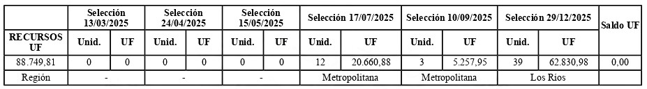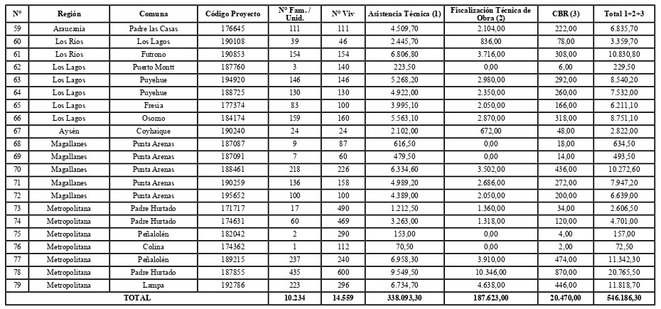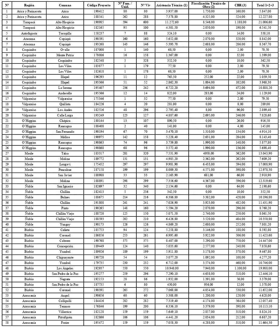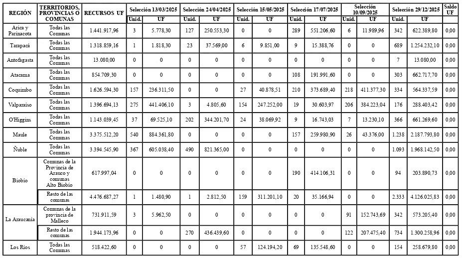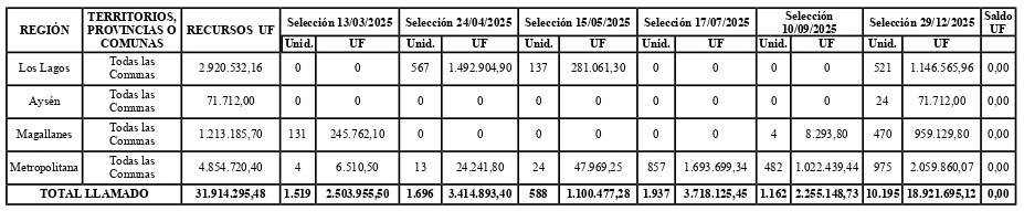 4. Los recursos comprometidos en el resuelvo 2 de la presente resolución, para los proyectos seleccionados en el cierre de postulación efectuado el día 29 de diciembre de 2025, del concurso a que se llamó por Resolución Exenta Nº 195 (V. y U.), de 2025, se resumen en el siguiente cuadro para cada región del país, incluyendo la suma total de familias beneficiadas y las Unidades de Fomento comprometidas, considerando los montos de subsidio de los proyectos, incluidos sus respectivos servicios de asistencia técnica y fiscalización técnica de obras: