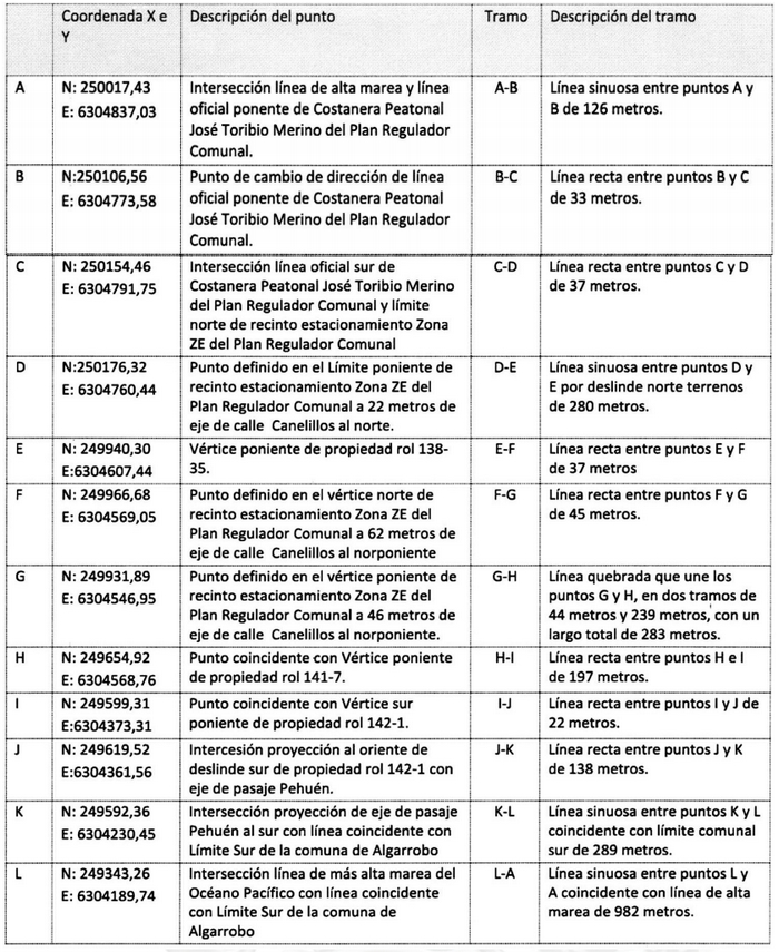 Artículo 6º.- El Límite Urbano del Plan Regulador Comunal de Algarrobo se define por la poligonal señalada en el Art. 2º de esta Ordenanza y cuyos puntos y tramos se describen a continuación: