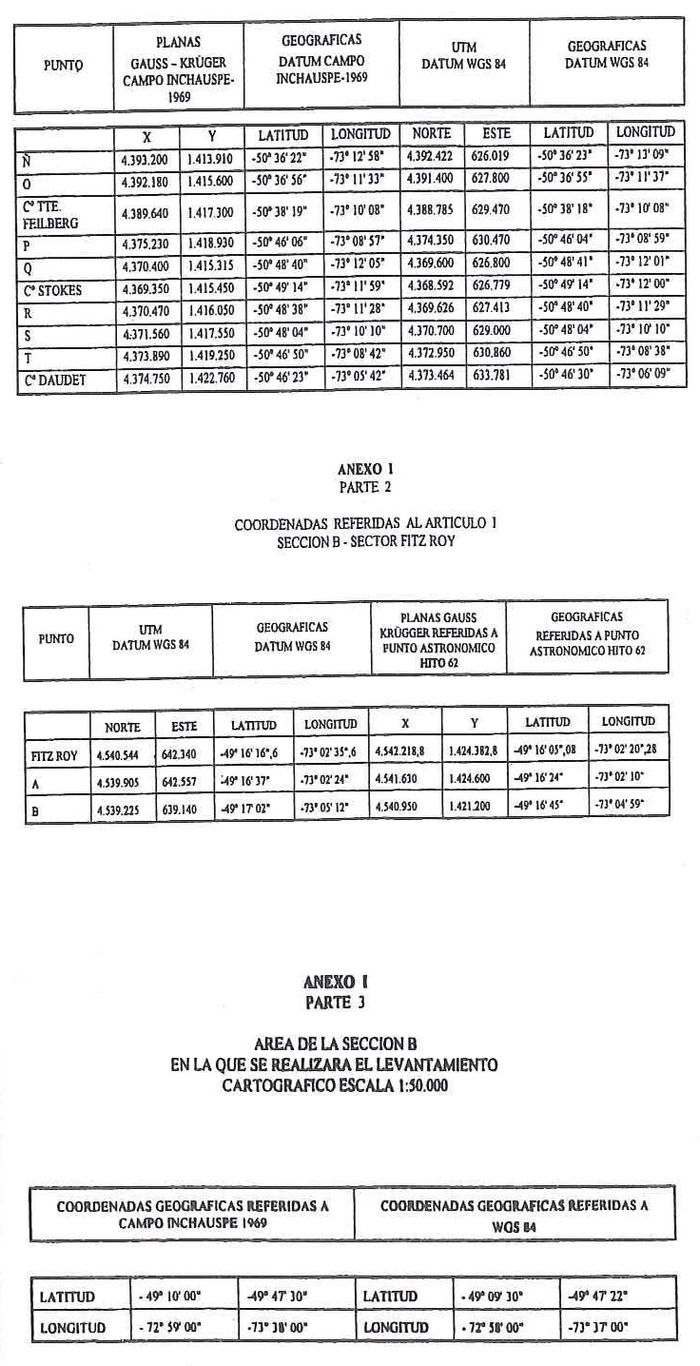 En la Sección B establecida en el Artículo I del presente Acuerdo, los valores de las coordenadas a partir del Monte Fitz Roy están referidos al Punto Astronómico Hito 62 de la Comisión Mixta de Límites Chile-Argentina. En el Anexo I se indican estas últimas coordenadas en dicho sistema y en el sistema WGS 84.