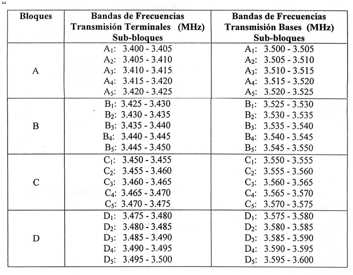 D.O. 22.11.2013 Artículo 2º: El ancho de banda disponible es de 200 MHz y la distribución de bloques de frecuencias es la siguiente: